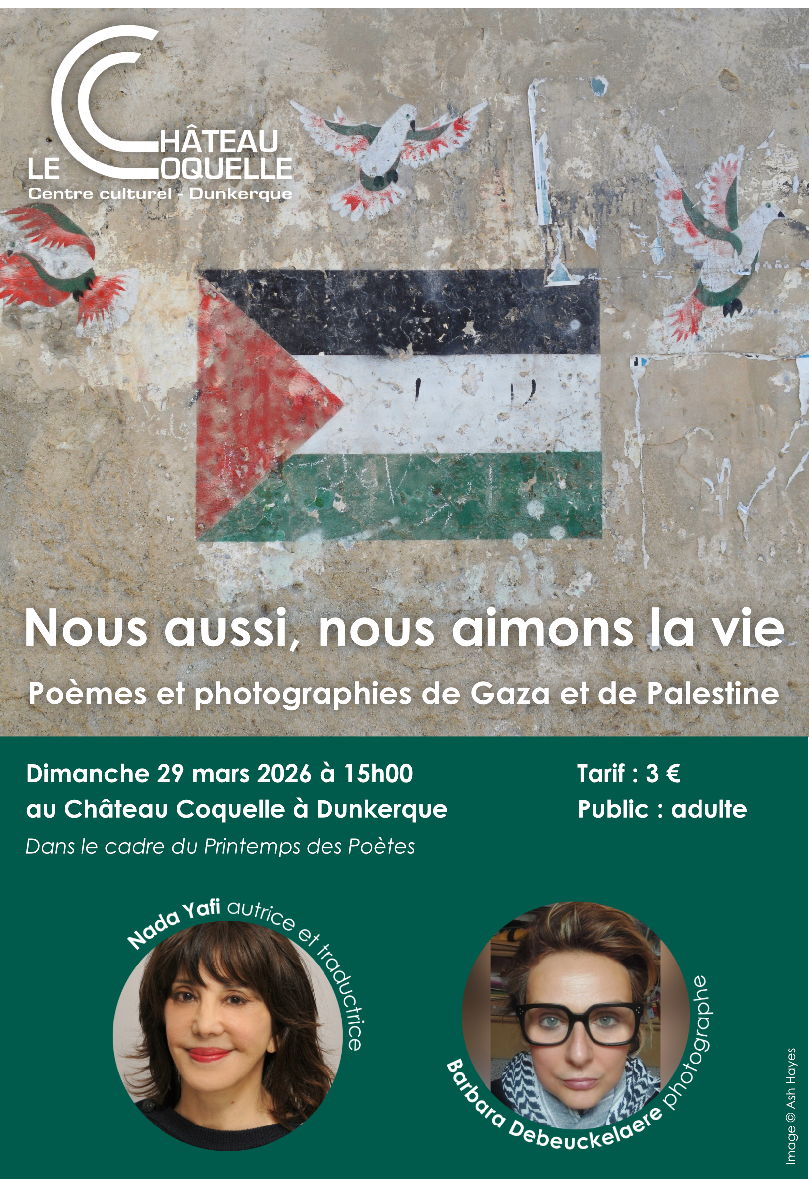 | Nous aussi, nous aimons la vie Poèmes et photographies de Gaza et de Palestine Dimanche 29 mars 2026 à 15h00 au Château Coquelle Public : Adulte Tarif : 3 € Dans la violence extrême et inhumaine du conflit de la bande de Gaza, les palestiniennes et les palestiniens continuent d’exister, de créer, et de lutter à Gaza et en Cisjordanie. C’est dans ce contexte et dans le cadre de ses missions de soutien à la création en photographie et en récits que le Château Coquelle propose un hommage à la poésie et à la photographie palestinienne. Nada Yafi, autrice qui a sélectionné et traduit les poèmes édités dans le recueil Que ma mort apporte l’espoir, poèmes de Gaza, nous présentera cet ouvrage aux côtés de la photographe Barbara Debeuckelaere qui introduira le livre Om/Mother réalisé avec 8 femmes palestiniennes de Hébron en Cisjordanie. Une des femmes photographes interviendra également en visioconférence depuis la Palestine. Avec cet événement, il s’agit d’explorer l’acte de création en photographie et en poésie comme un acte de résistance. Avec la participation de l’association AFP Dunkerque-Gaza. Les ouvrages présentés seront disponibles à la vente sur place, en collaboration avec la librairie La Bouilloire aux Livres (règlement chèque ou espèce). Dans le cadre du Printemps des Poètes 2026 qui se déroule du 14 au 31 mars 2026, sur le thème « La liberté. Force vive, déployée ». Inscription en ligne |